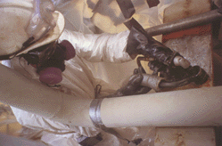 An Encapsulant Latex Air Glue will be sprayed on surfaces throughout contaminated area, if required. All floors are covered with plastic. All surfaces which contain dirt or solid grease are sprayed only after surface dust has been removed.